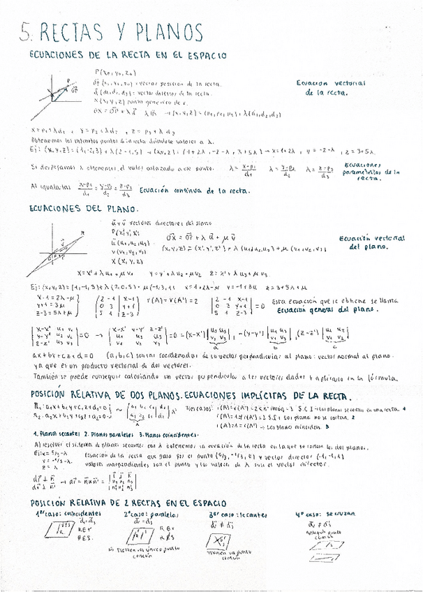 Incluye ecuaciones de la recta en el espacio, las ecuaciones del plano, la posición relativa de dos planos, la ecuaciones implícitas de la recta, la posición relativa de dos rectas en el espacio y su estudio, la posición relativa de una recta y un plano,