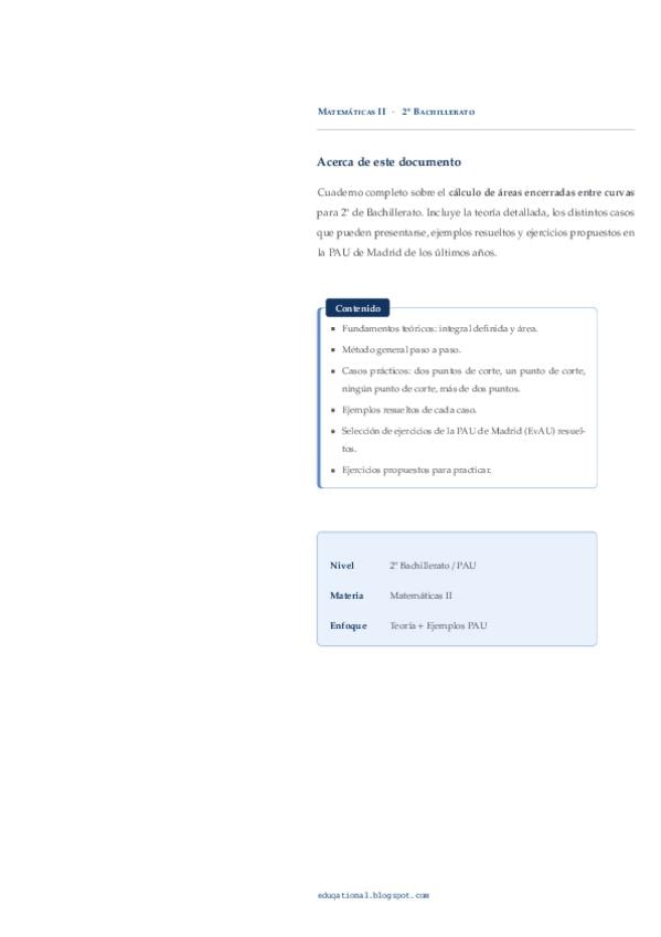 Apuntes sobre como calcular el área encerrada entre curvas, vienen distintos ejemplos de los diferentes casos que podemos encontrar. Además se incluyen ejercicios propuestos en la PAU y ejercicios para realizar
