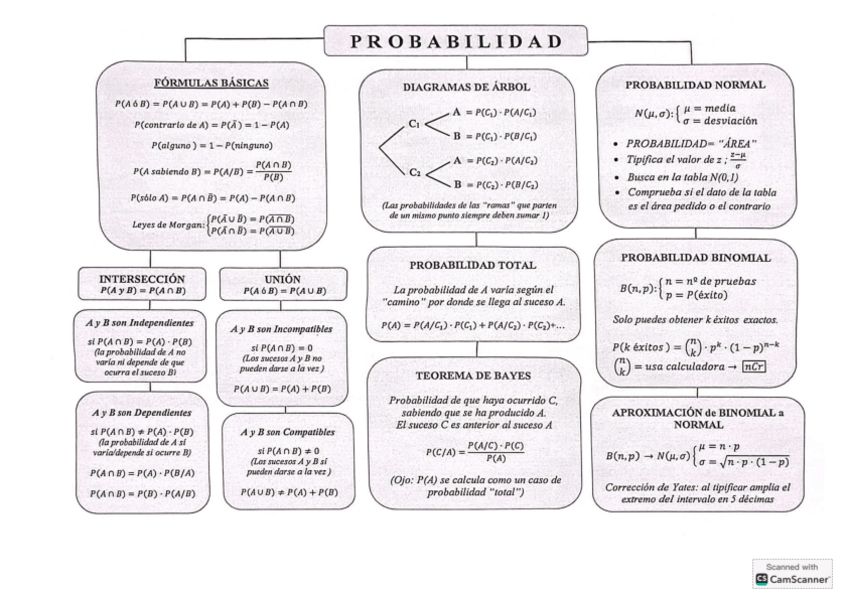 Resumen completo de los conceptos del tema 9 de probabilidad necesarios para la PAU. Se sigue el esquema del libro de 2º Bach. de Matemáticas II, editorial Casals.