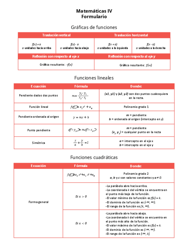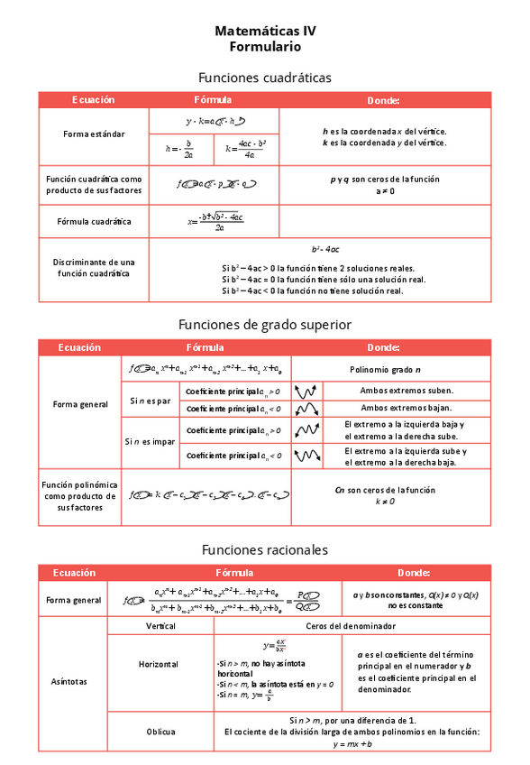 Formulario (Gráficas de funciones, Funciones lineales, Funciones cuadráticas, Funciones de grado superior, Funciones racionales, Funciones seccionadas, Funciones exponenciales, Funciones logarítmicas, Funciones trigonométricas, Continuidad)