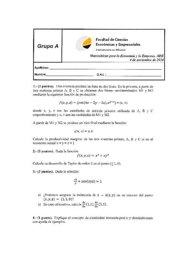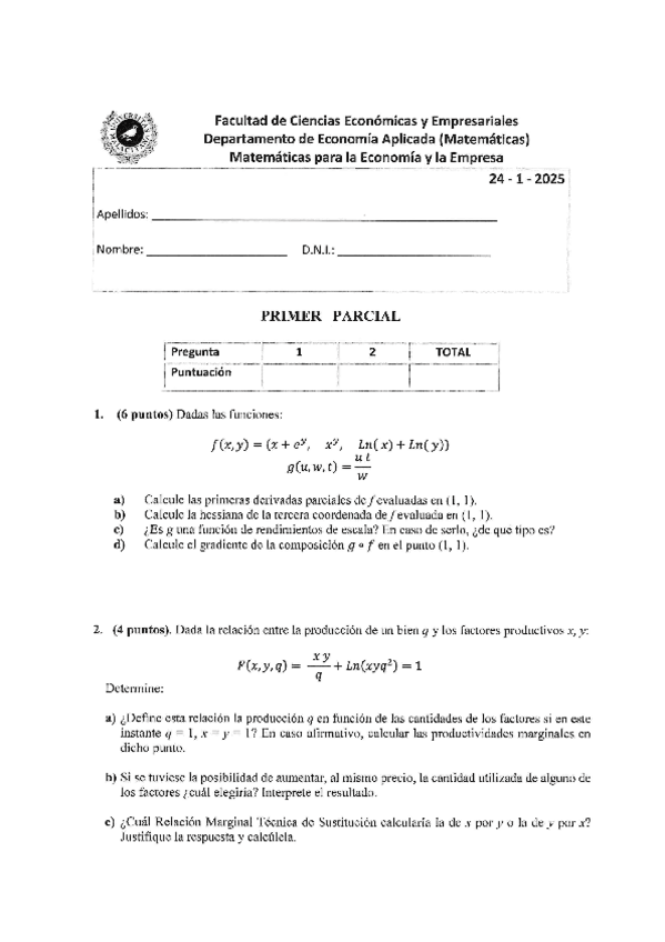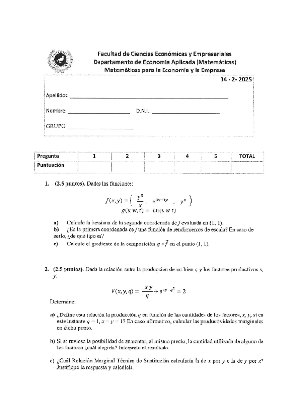 He publicado nuevos examenes de 1º Matemáticas para la Economía y la Empresa: Examen.pdf