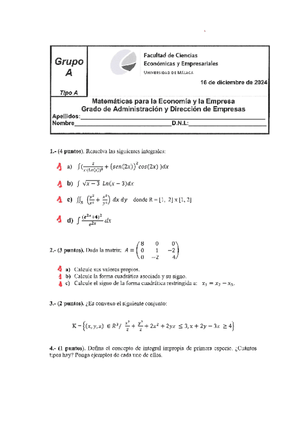 He publicado nuevos examenes de 1º Matemáticas para la Economía y la Empresa: Integrales-examenes.pdf