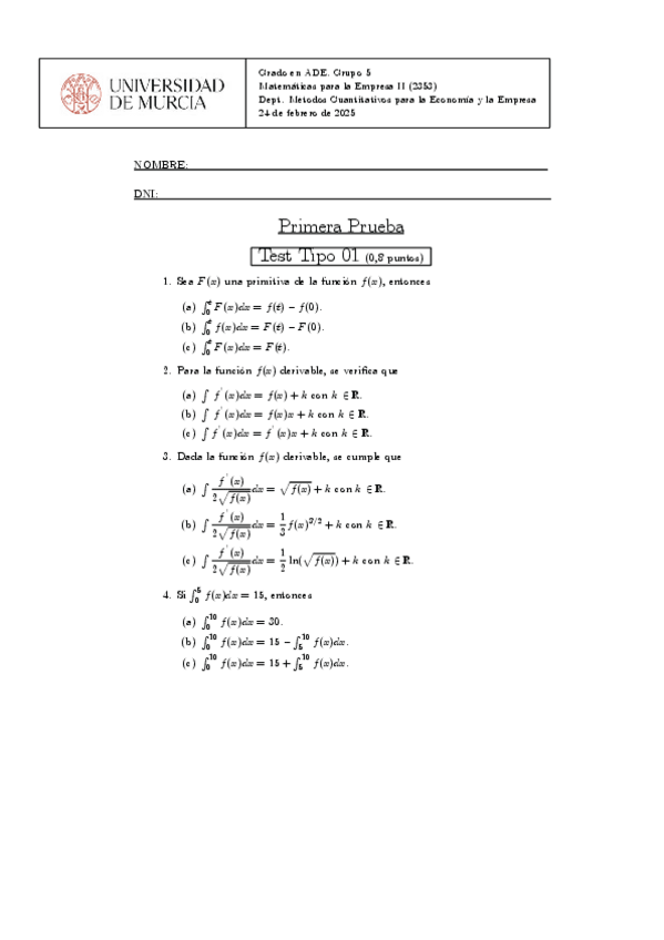 He publicado nuevos examenes de 1º MATEMÁTICAS PARA LA EMPRESA II: Pruebaintegrales24.pdf