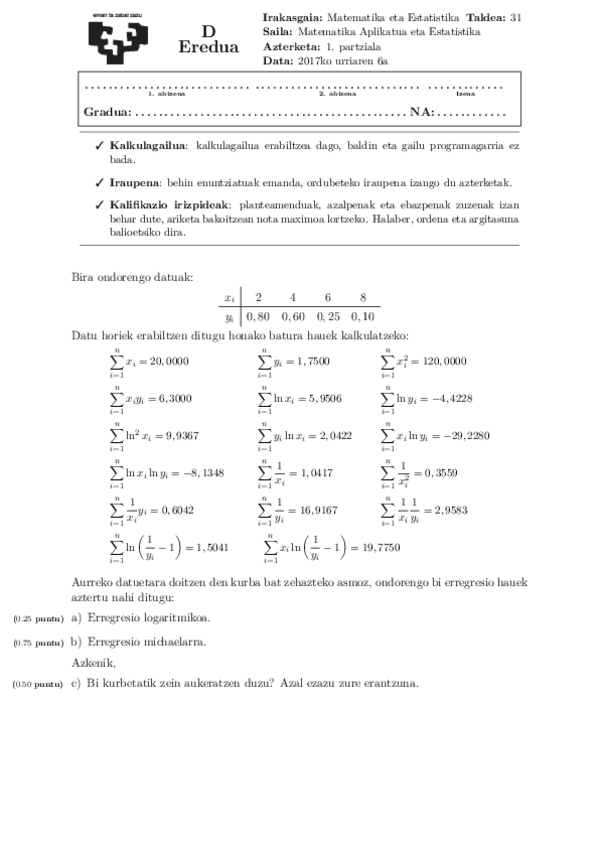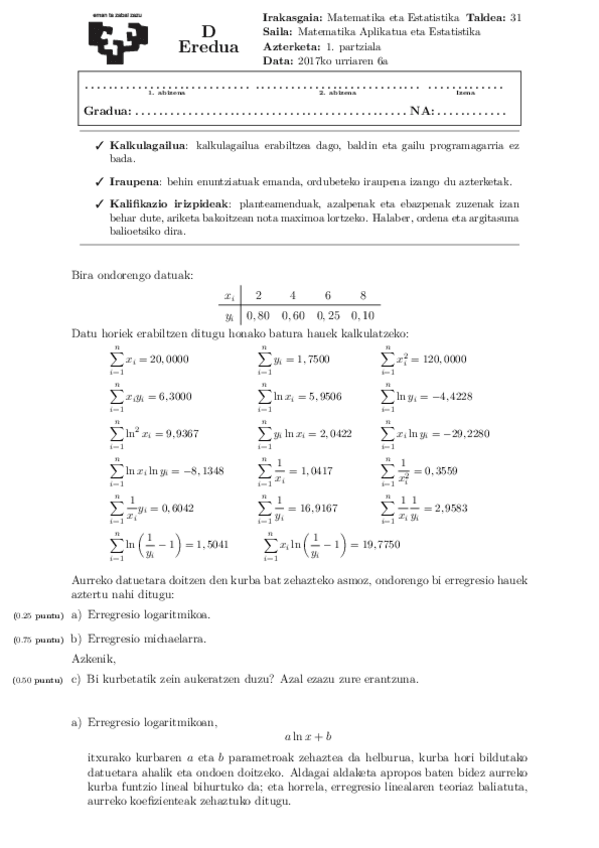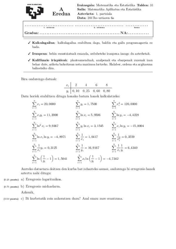 2025eko lehenengo partziala (Erregresio ereduak, deribatuak eta integralak) Matematika eta estadistika.