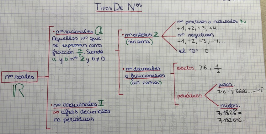 Esquema de los tipos de números reales en las matemáticas, ejemplos y explicaciones básicas y fáciles.