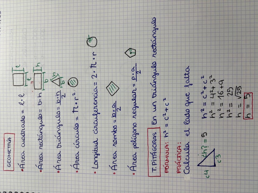 Fórmulas explicación y ejemplos de geometría y teorema de Pitágoras.