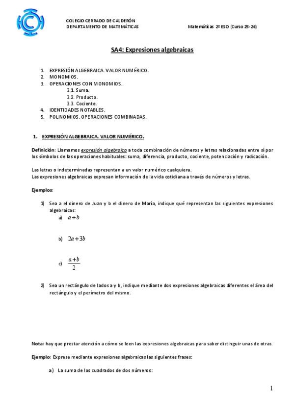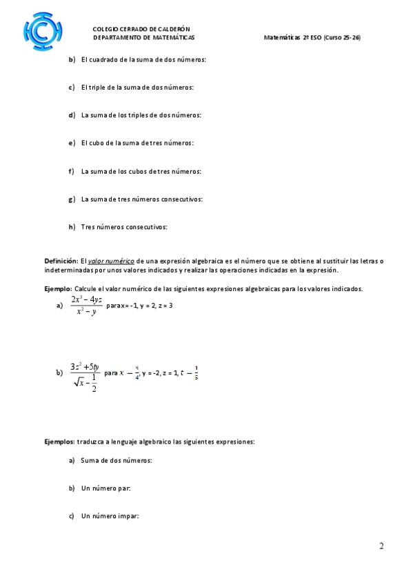 APUNTES DE MATEMÁTICAS DE 2 DE LA ESO SOBRE LAS EXPRESIONES ALGEBRAICAS Y LOS MONOMIOS