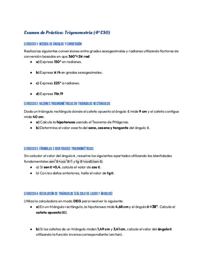 Examn de práctica del tema de trigonometría, contiene el solucionario.