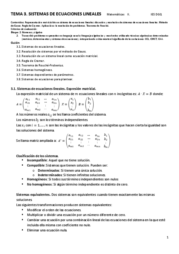 Tema sistemas lineales (matrices) explicado a detalle con formulas y ejercicios. Sistemas lineales. Gauss. ecuación matricial. Cramer Rouché-Frobenius. Sistemas homogéneos parámetros
