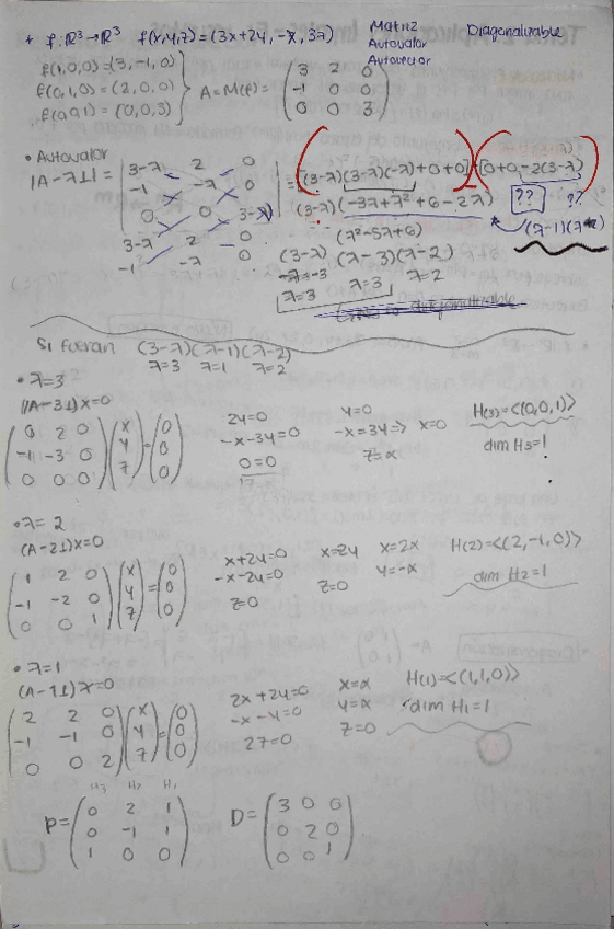 EJERCICIO RESUELTO: A partir de un conjunto; hallar sus autovalores; sus autovectores; su matriz de paso y su matriz diagonal; y decir si es diagonalizable o no.