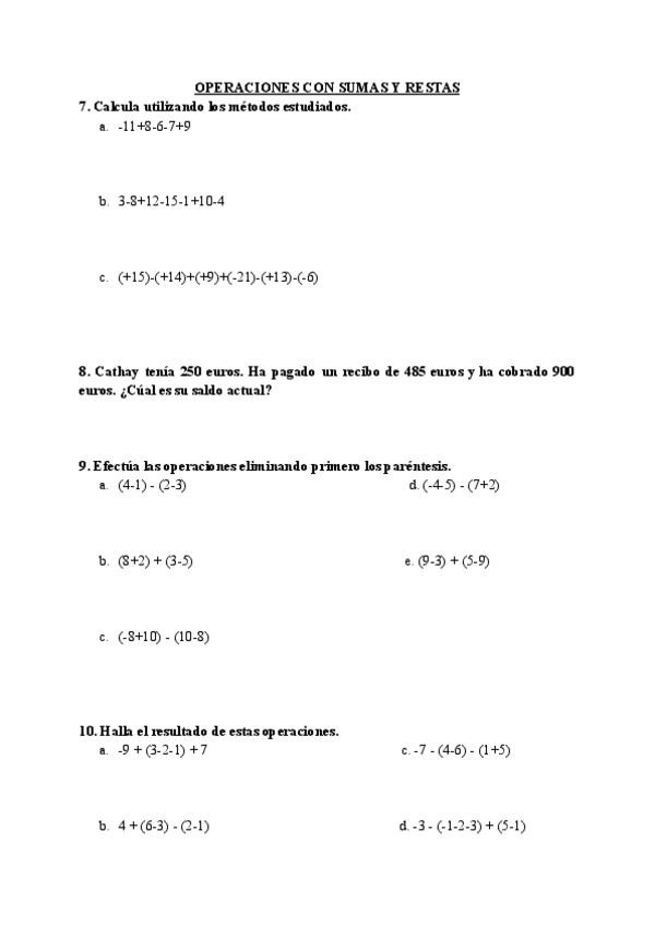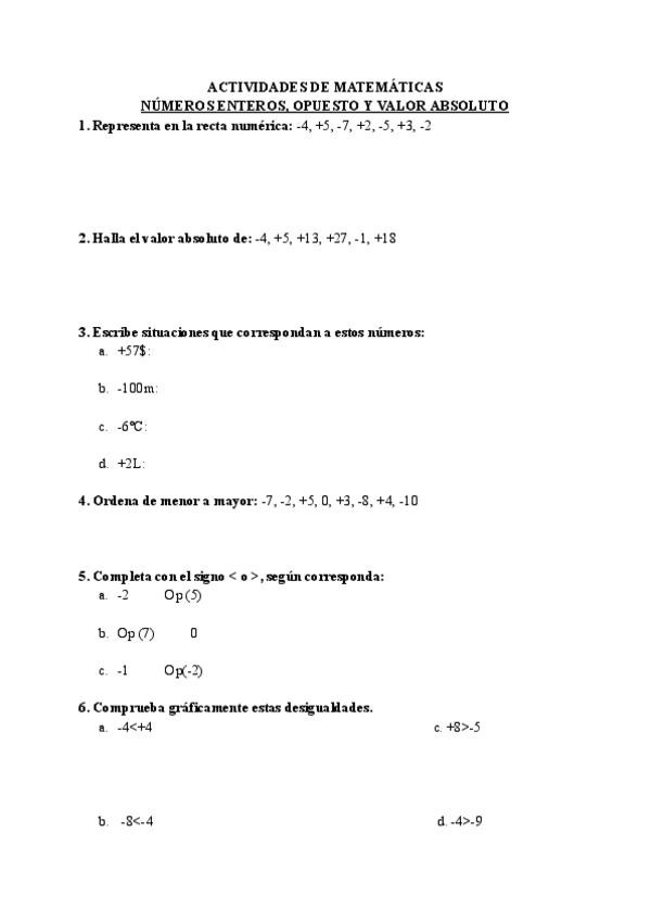 En el siguiente documento encontrarás un total de 18 actividades de matemáticas tipo examen, centradas en los números enteros, sus opuestos y el valor absoluto. Incluye ejercicios de operaciones con sumas y restas, multiplicaciones y divisiones, así como