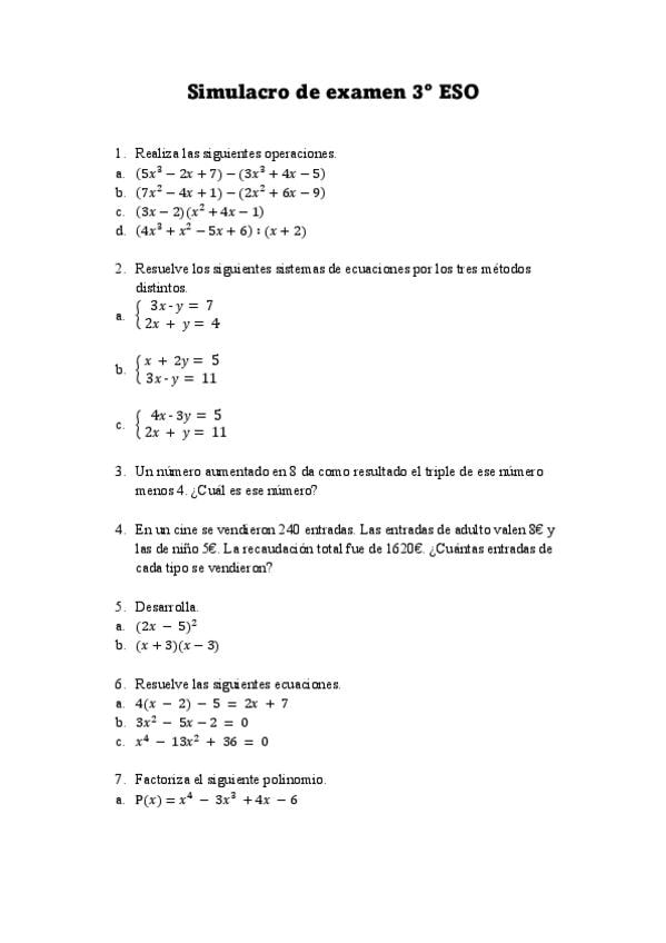 Simulacros de examen o prueba corta y ejercicios de repaso de Álgebra para tecero de eso. Operaciones con polinomios, ecuaciones, sistemas y problemas. Todo con las soluciones incluidas.