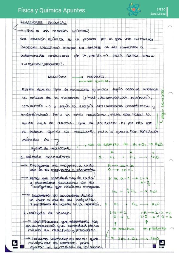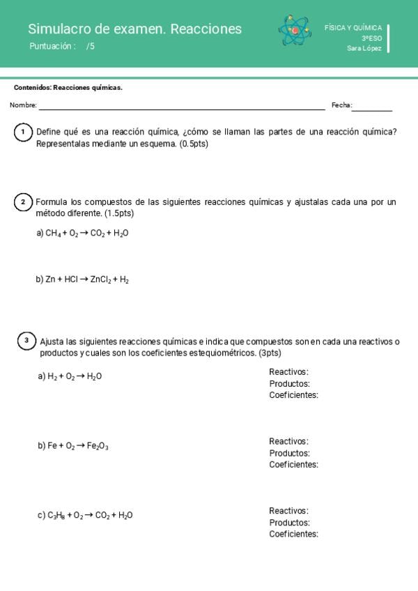 Pequeño resumen de reacciones químicas y ajustes de reacciones químicas. El archivo contiene ejemplos y una ficha de simulacro de examen con las correcciones correspondientes.