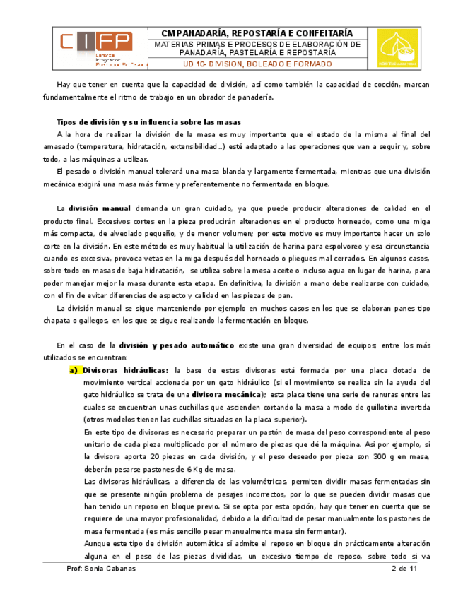 He publicado nuevos apuntes de Materias primas y procesos en panadería, pastelería y repostería: 10. División, boleado y formado.pdf