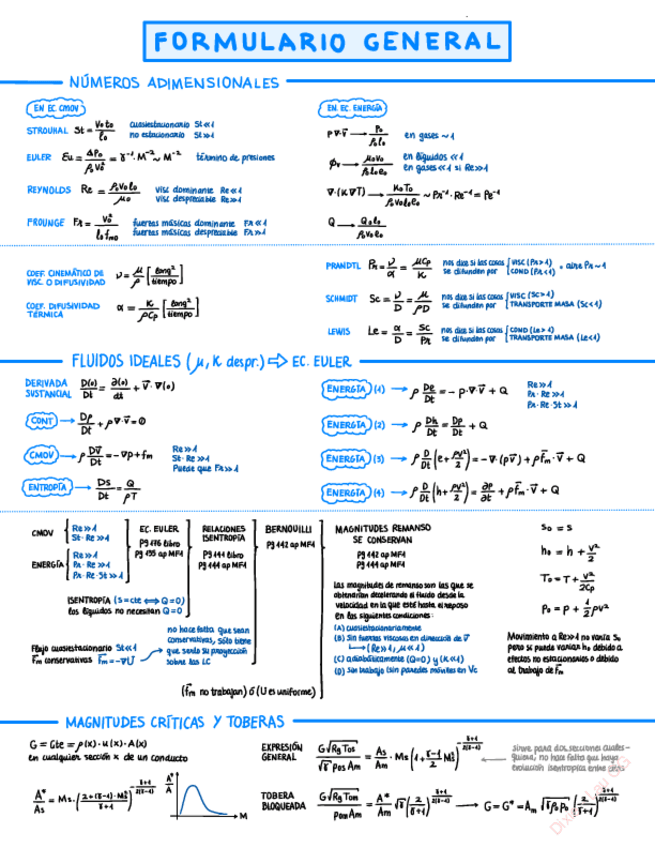 Formulario COMPLETO con todo el temario de fluidos II. Sirve para problemas y teoría. Tiene resúmenes de órdenes de magnitud y de cómo hacer ejercicios paso a paso. Recomendable descargarse también mis apuntes del temario completo de la asignatura.