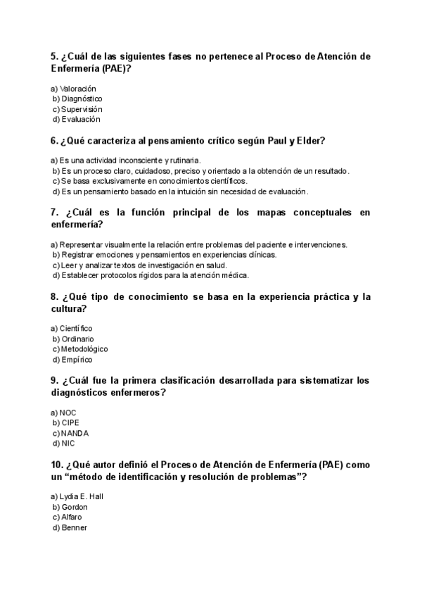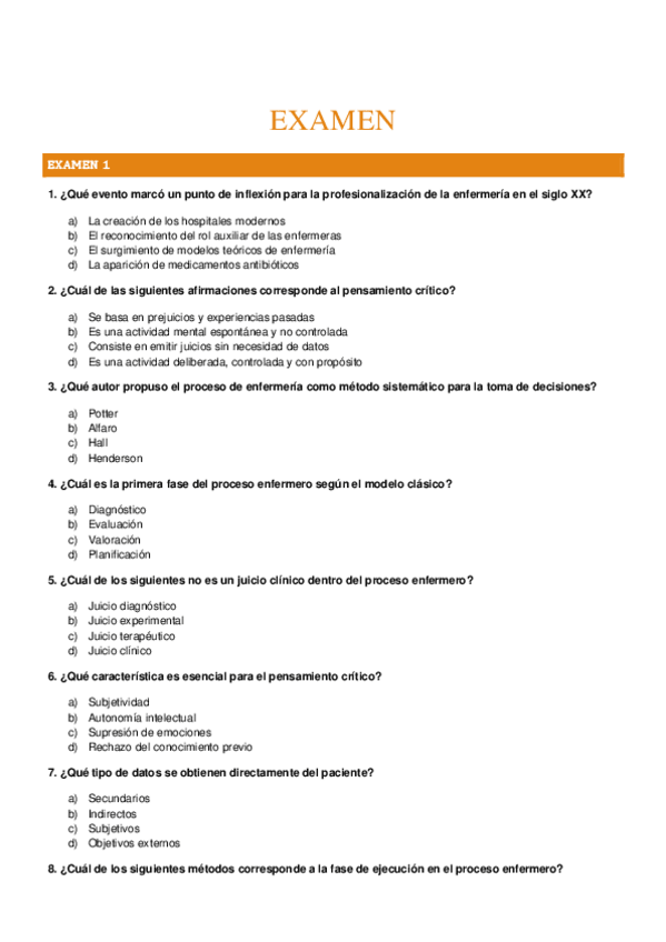 OPCIONES DE TEST DE METODOLOGÍA TEMA 1 Y 2: TEMA 1: EL JUICIO CLÍNICO ENFERMERO. TEMA 2: PENSAMIENTO CRÍTICO