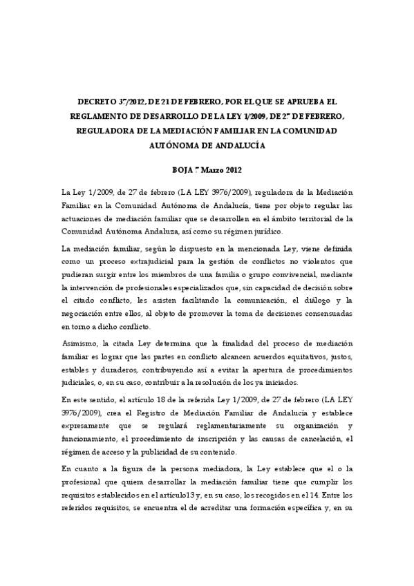 He publicado nuevos otros de 4º Métodos Alternativos de Resolución de Conflictos: Reglamento 37.2012 Desarrollo de Mediación familiar en Andalucía.pdf