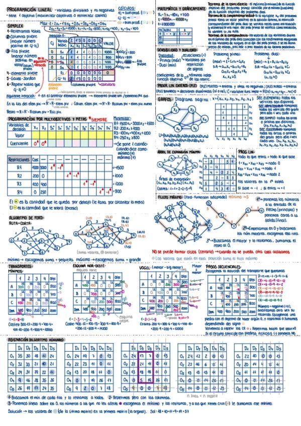Resumen del 2º Bloque: Programación en grafos. Incluye los temas: 4. Transporte 5. Flujo a coste mínimo (transbordo) 6. Ruta mínima 7. Flujo máximo