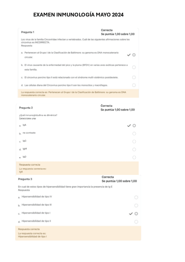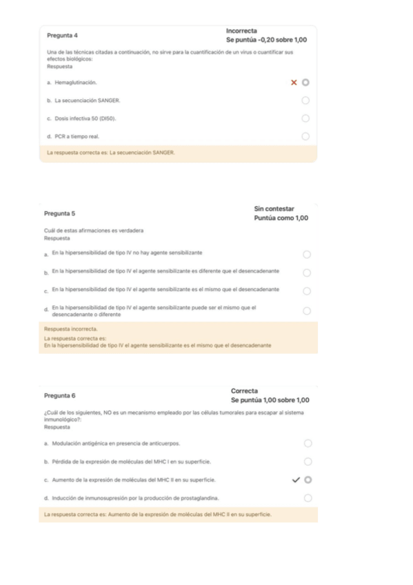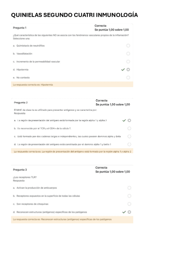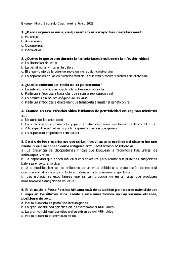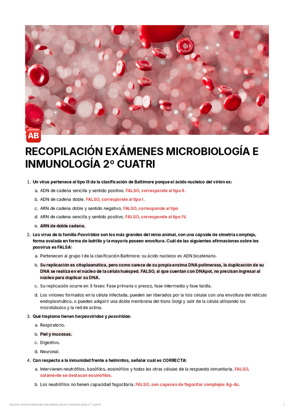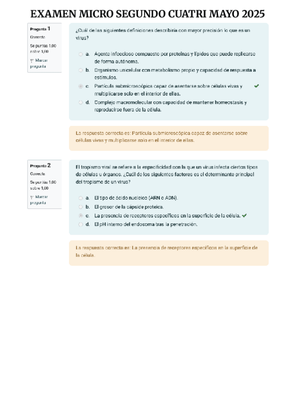 Este documento te ayudará sobre todo para el examen teorico que se hace por moodle del 2o Cuatrimestre de Microbiología e Inmunología. Estas preguntas son sobre Virología e Inmunologia y tienen los resultados tras cada pregunta.