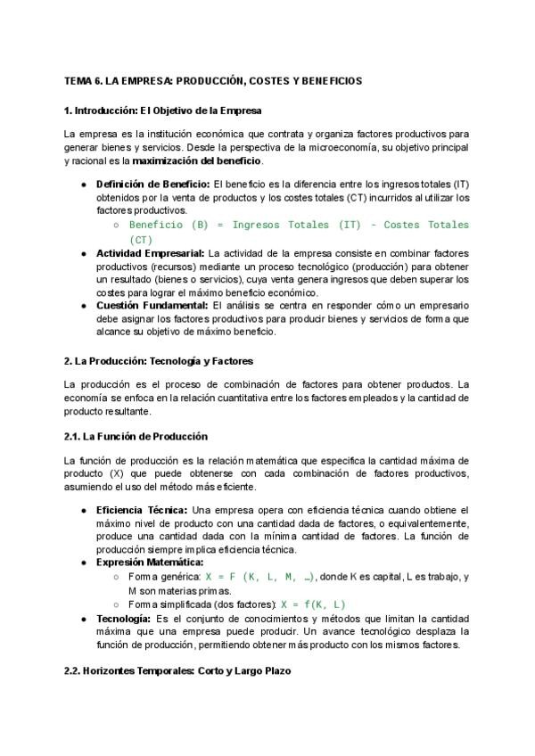 Apuntes Microeconomía Tema 6: LA EMPRESA. PRODUCCIÓN, COSTES Y BENEFICIOS.