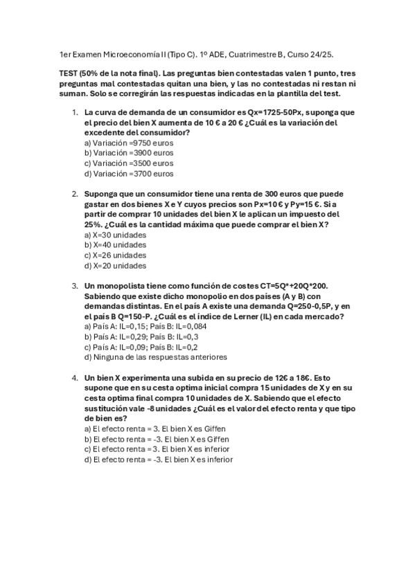 CreadoresPrimer Parcial de Microeconomía II Modelo C Curso 2024/2025 Cuatrimestre B. 12 Cuestiones Tipo Test, 2 Cuestiones de Respuesta Abierta y 1 Problema.