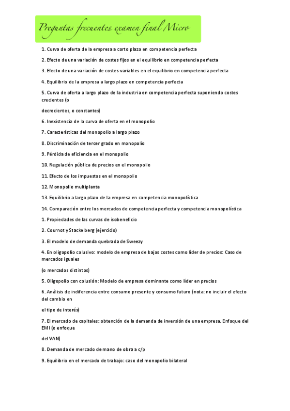 Posibles preguntas para la parte teórica del examen de microeconomía. Las preguntas de la 1 a la 14 corresponden a los temas 1-4 y las preguntas de la 15 a la 28 corresponden a los temas 5-10