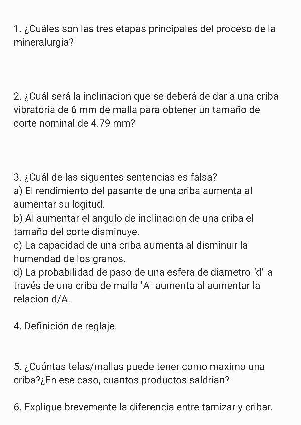 Simulacro para preparar el primer parcial de mineralurgia. Algunas de ellas son de exámenes pasados, otras son inventadas.