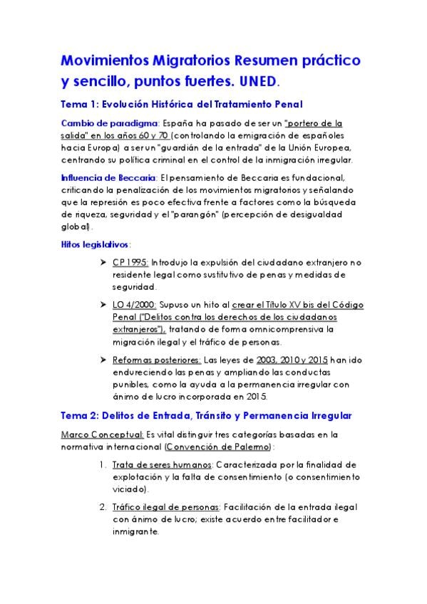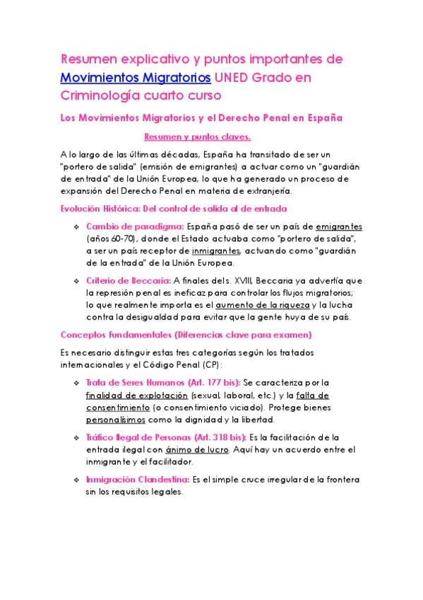 Resumen flash Movimientos Migratorios, grado en criminología, UNED, cuarto curso.