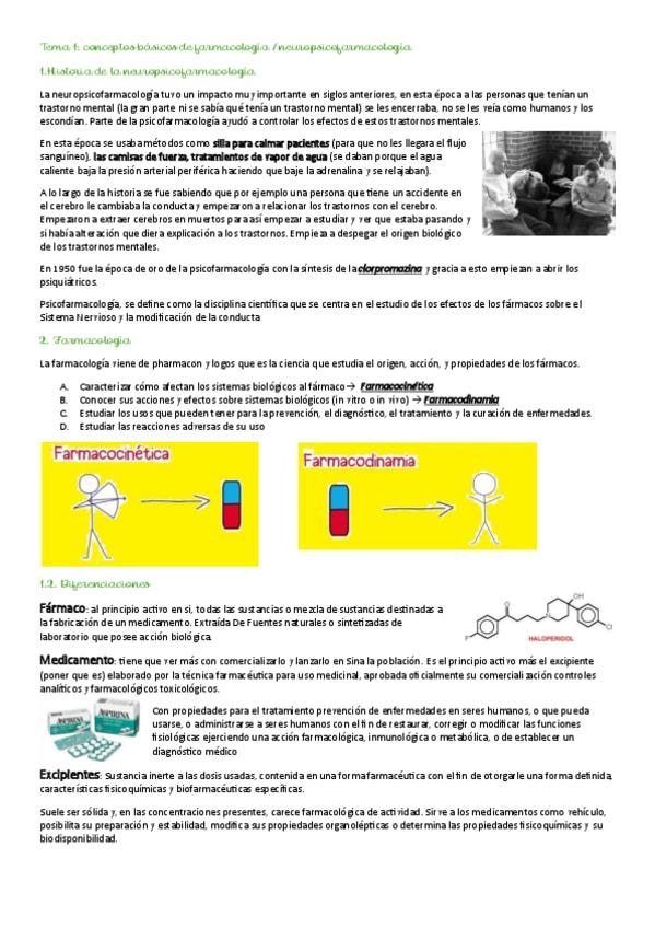 Apuntes completos del primer tema de Psiconeurofarmacología: conceptos básicos. Redactados a partir de las diapositivas de clase y aclaraciones de la profesora. Incluye definiciones, esquemas y ejemplos que pueden ayudar en el estudio de la asignatura. Es