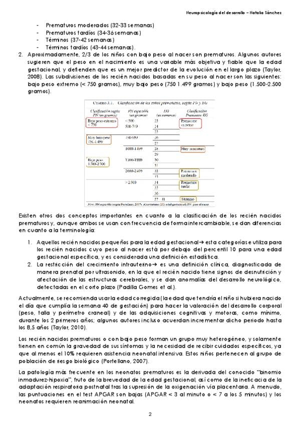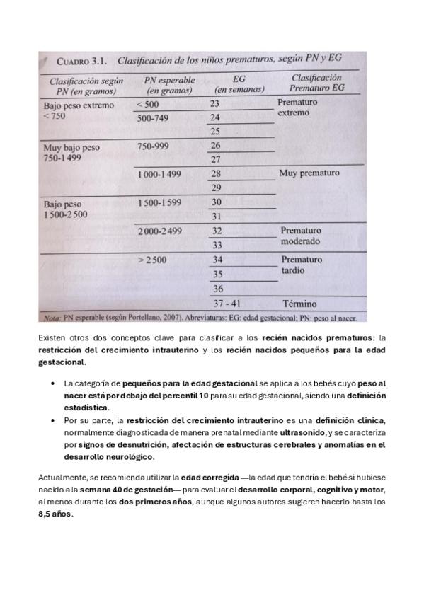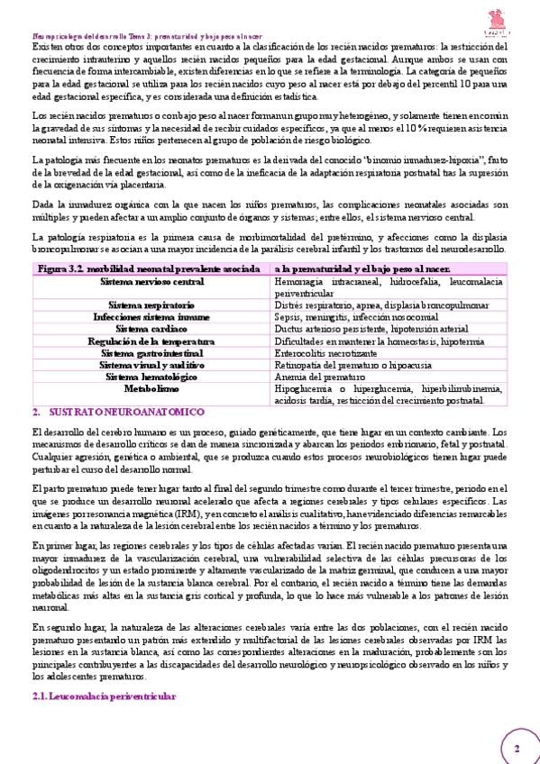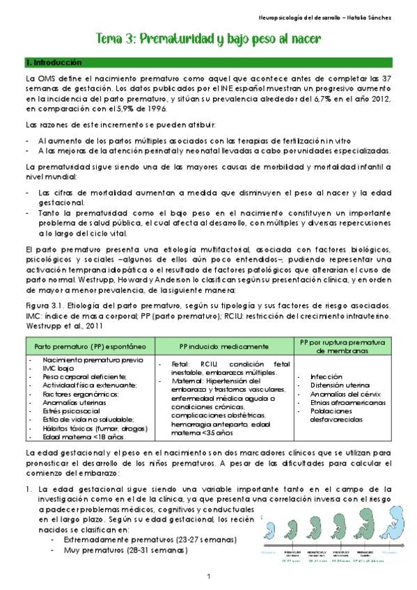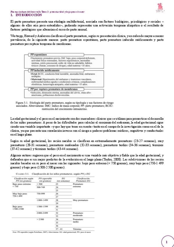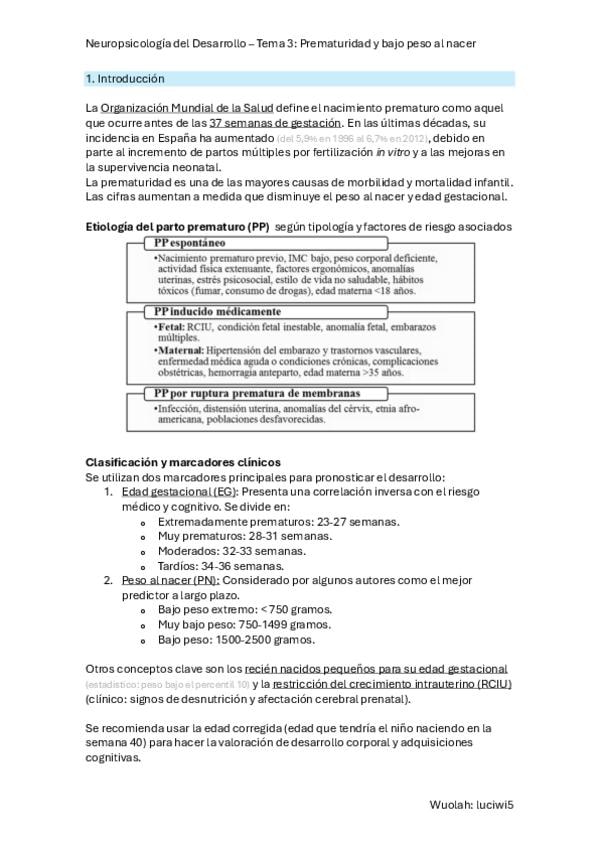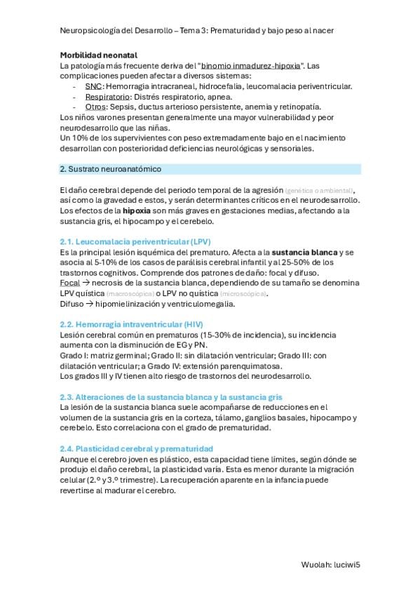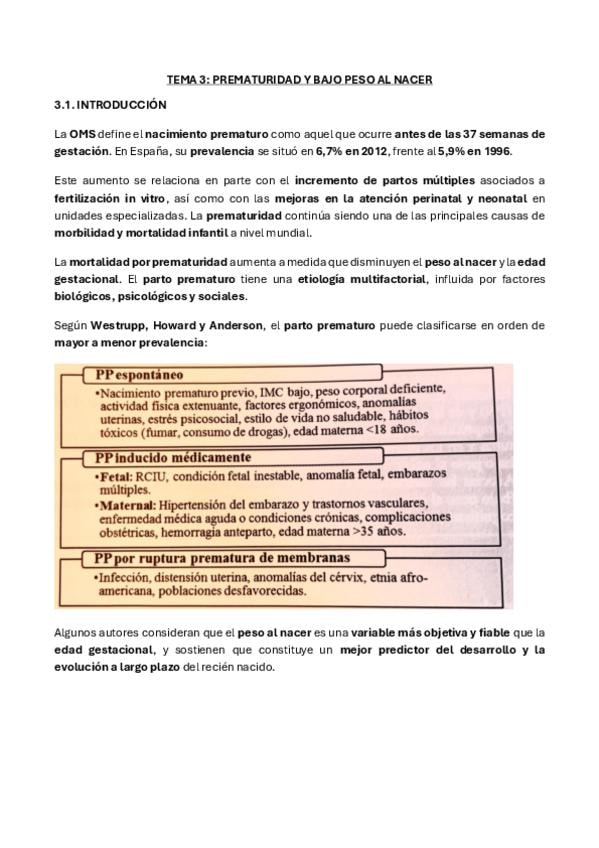Resumen TEMA 3 - PREMATURIDAD Y BAJO PESO AL NACER de Neuropsicología del Desarrollo