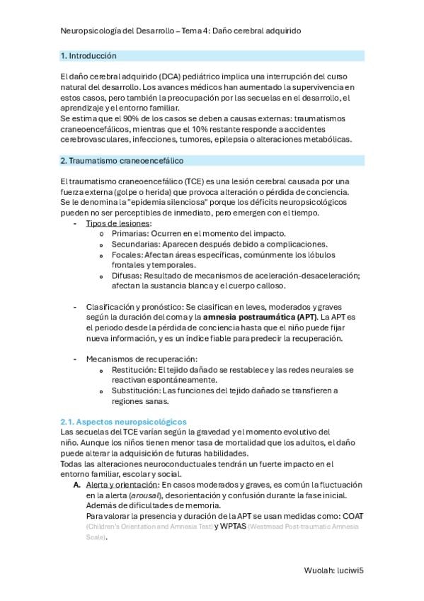 Presentación tema 4 Neuropsicologia del desarrollo sobre el daño cerebral adquirido