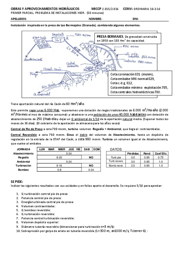 He publicado nuevos examenes de 4º Obras Hidráulicas II: OAH MICCP 2015 2016 EX PROBL largo Instalac Bermejales 10 2 16.pdf