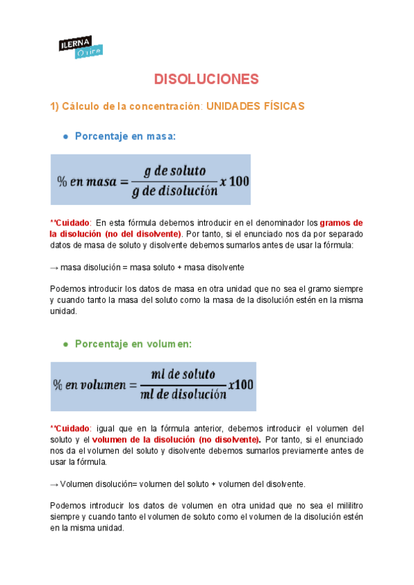 formulas necesarias para calcular concentraciones de disoluciones de todos los tipos.