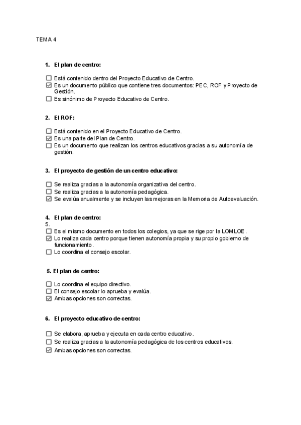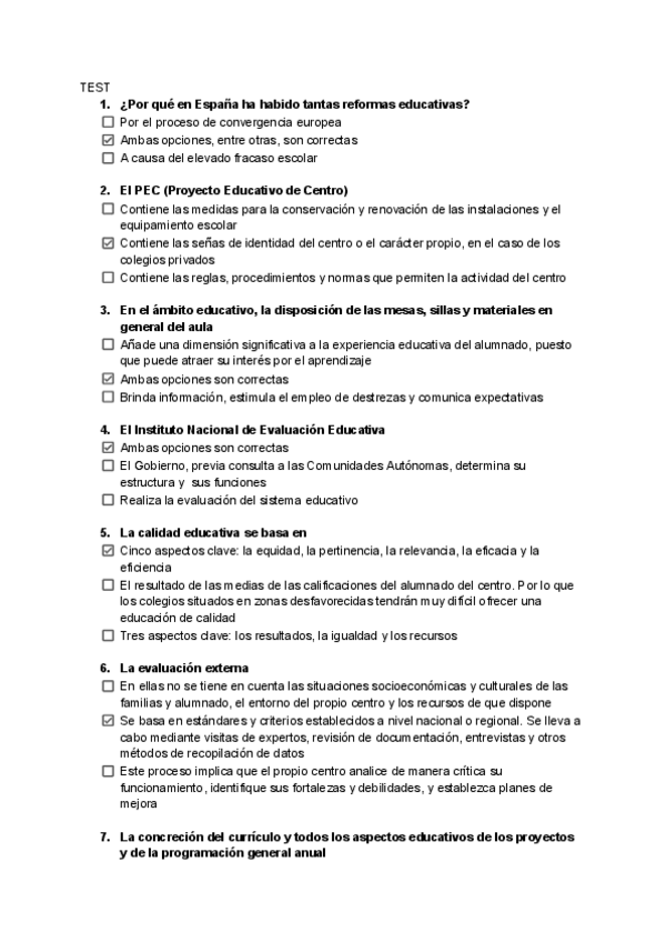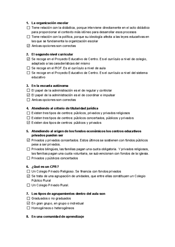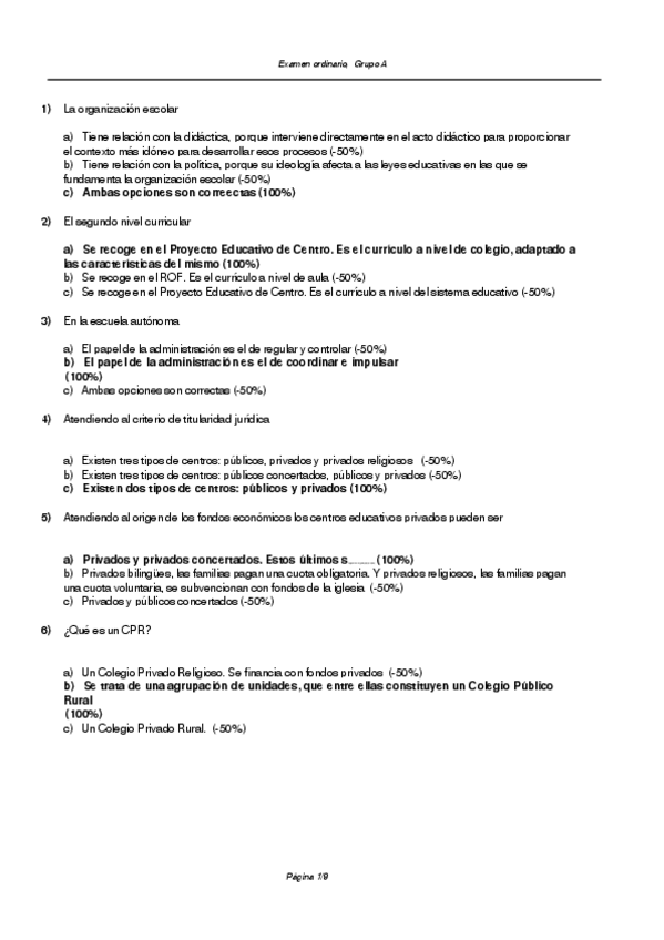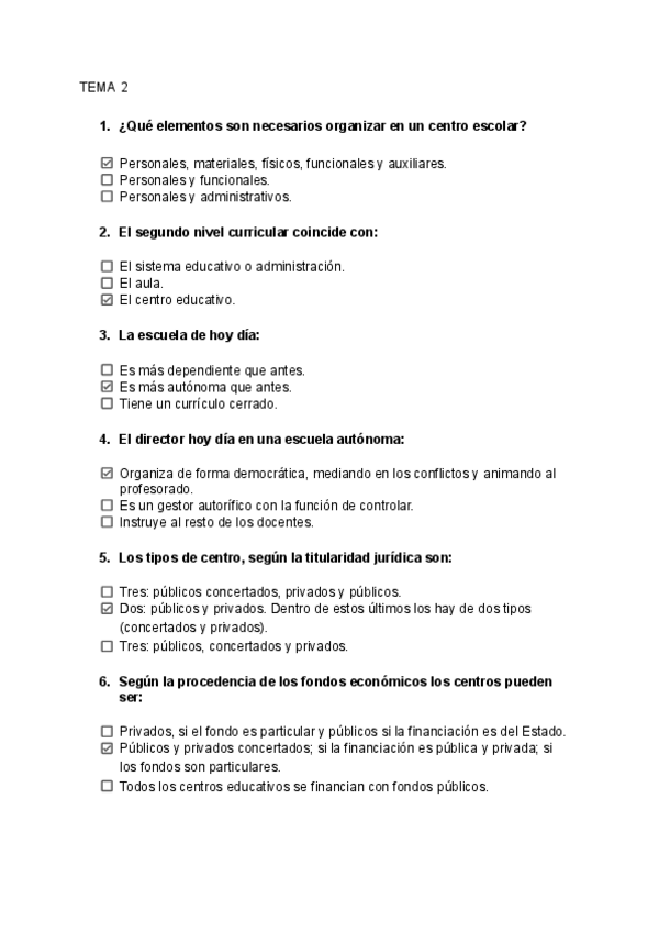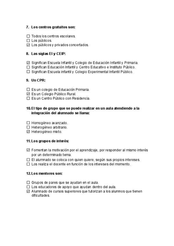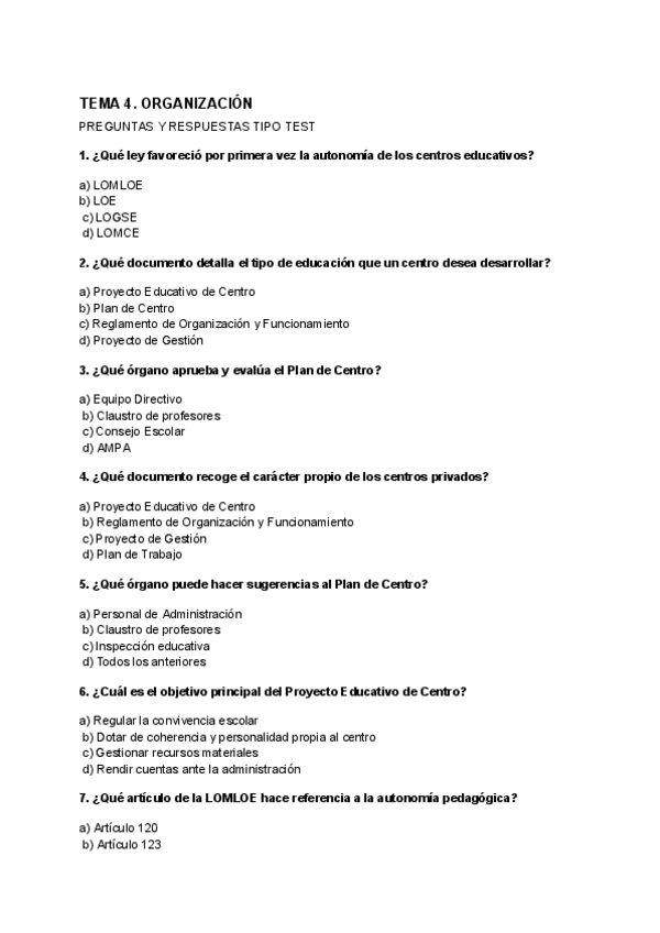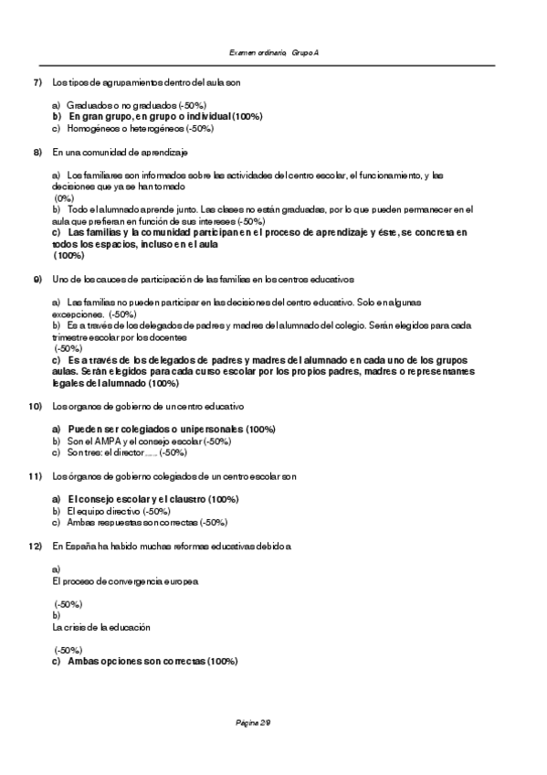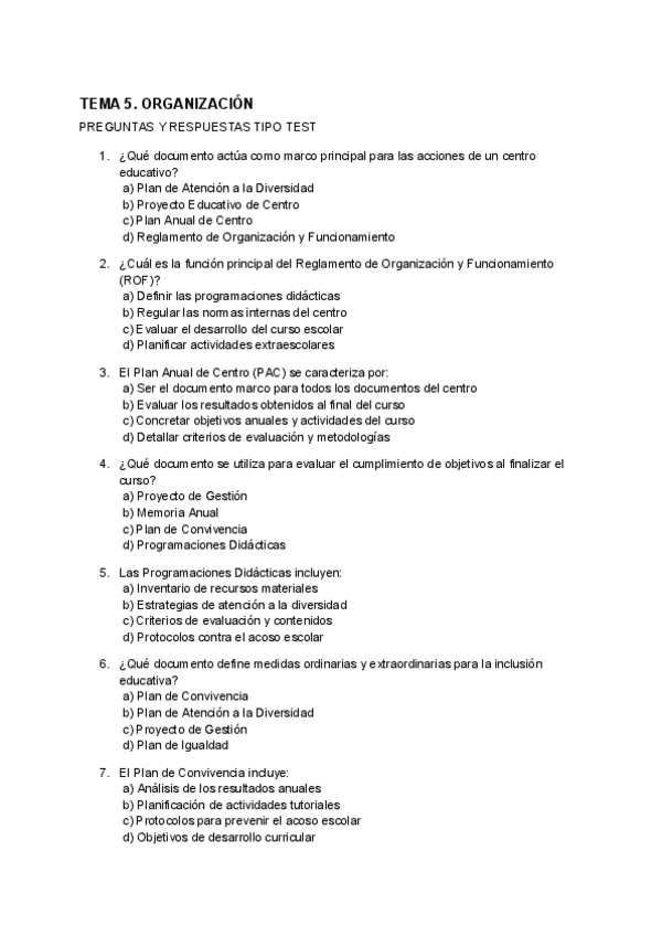 Preguntas tipo test de Examen - Organización del centro y del aula