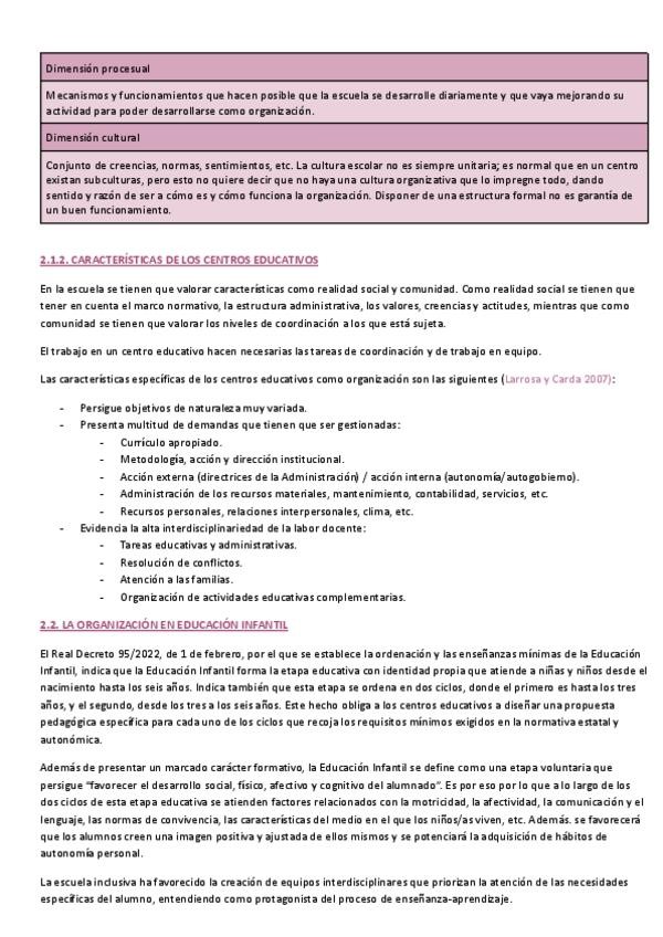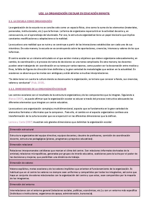 Resumen completo de la UD2 (la organización escolar en E.I.) de la asignatura Organización y Planificación en Educación Infantil (OP)