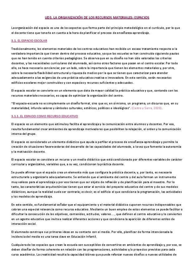 Resumen completo de la UD3 (la organización de los recursos materiales: espacios) de la asignatura Organización y Planificación en Educación Infantil