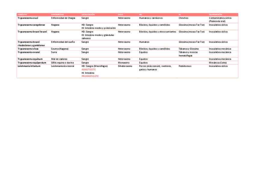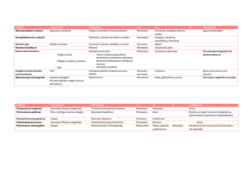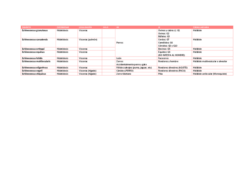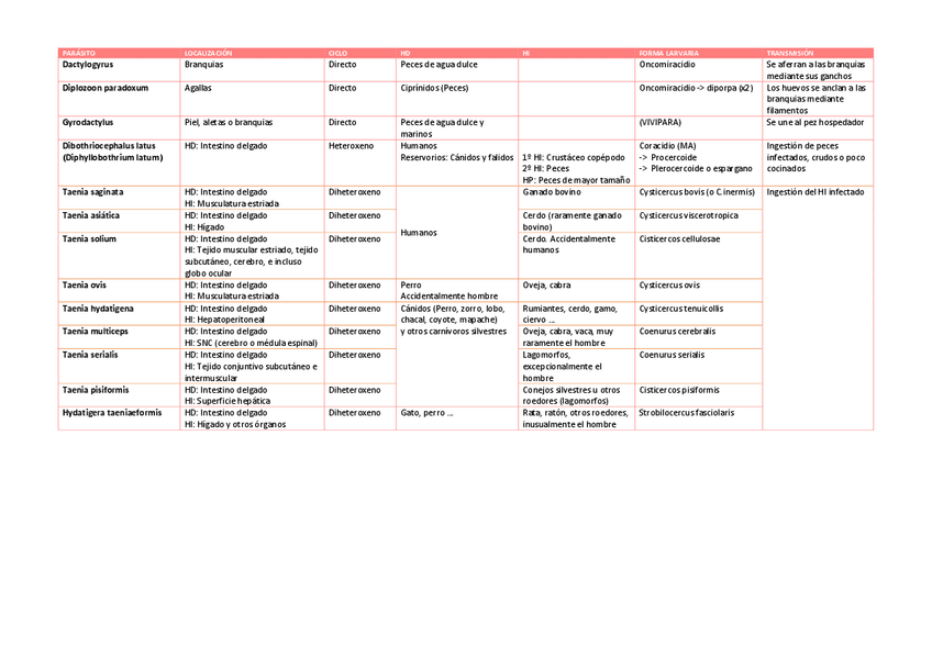 Tabla parásitos para el 1º parcial