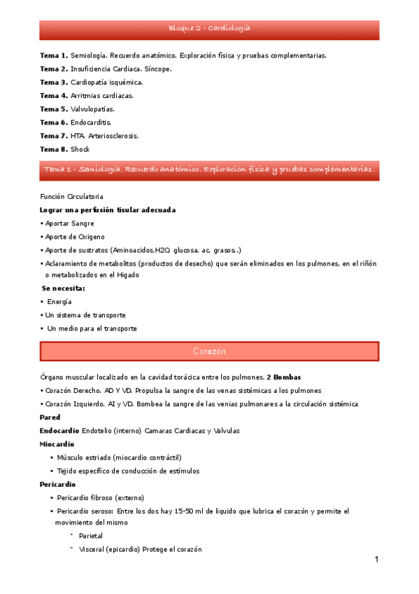 Tema 1. Semiología. Recuerdo anatómico. Exploración física y pruebas complementarias. Tema 2. Insuficiencia Cardiaca. Shock Tema 3. Cardiopatía isquémica. Arteriosclerosis. Tema 4. Arritmias cardiacas. Tema 5. Valvulopatías. Tema 6. Endocarditis. Tema 7.