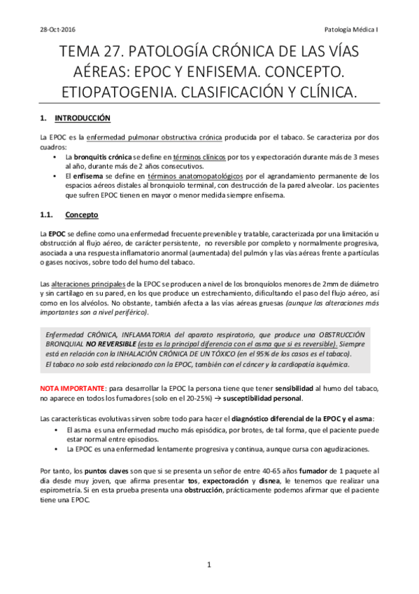 He publicado nuevos apuntes de 4º Patología Médica de Sistemas:: Tema 27. Patología crónica de las vías aéreas (EPOC y Enfisema). Concepto Etiopatogenia Clasificación y Clínica.pdf