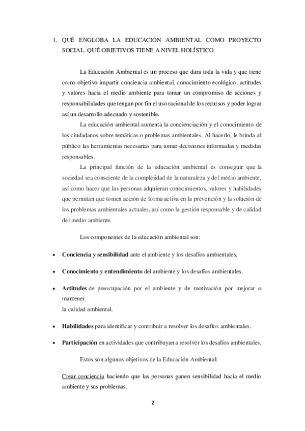 Práctica con preguntas sobre el significado de pedagogía ambiental, metodologías a utilizar, etc