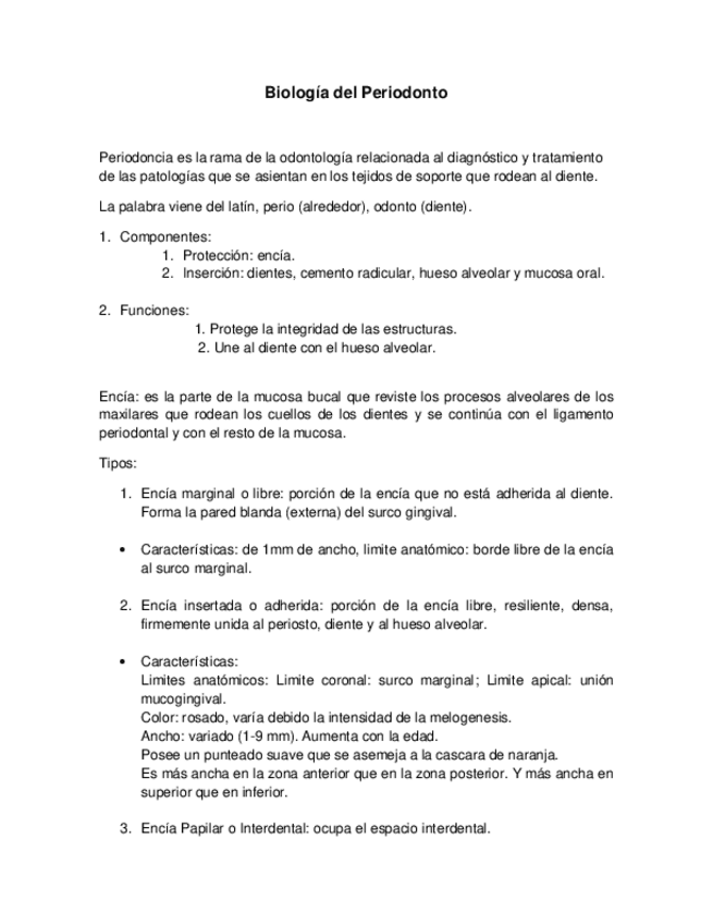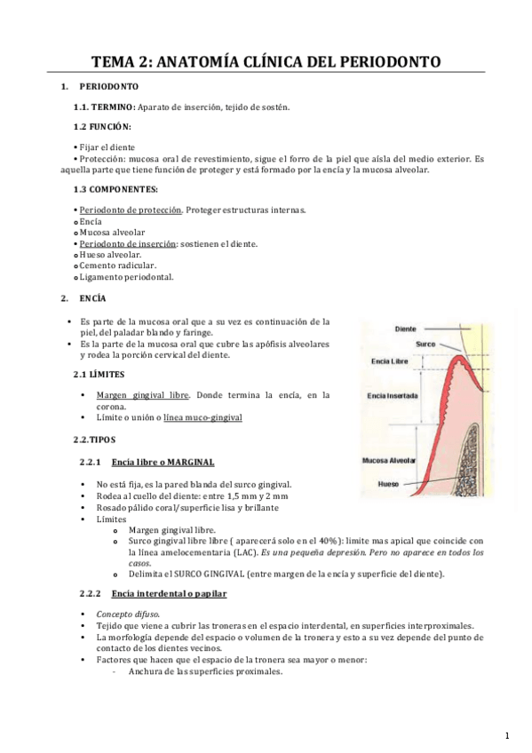 Biología del periodonto y encía. Incluye cuadro con diferencias entre una encía normal y una patológica según características como color, textura, consistencia, posición, tamaño.