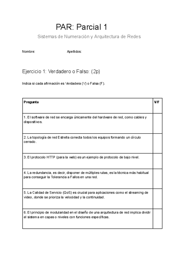Modelo de examen de UD 1 y 2: Caracterización de Redes, Arquitectura de Redes (Sin Resolver) - Parcial 1 (A)