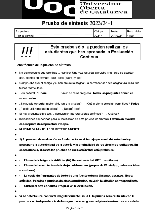He publicado nuevos examenes de 3º Política Criminal: Prueba de Síntesis 2024