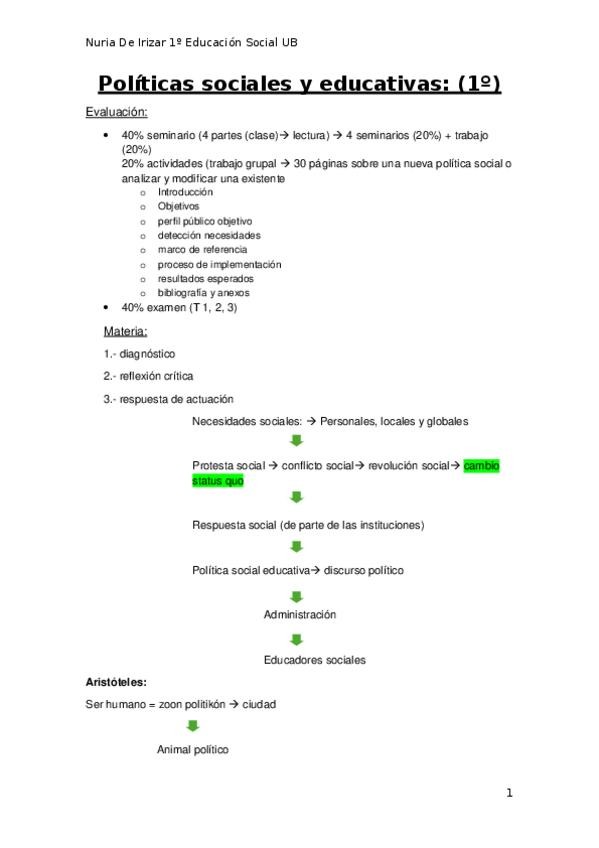 Tot el temari de l'assignatura de polítiques Socials i Educatives de primer de carrera.