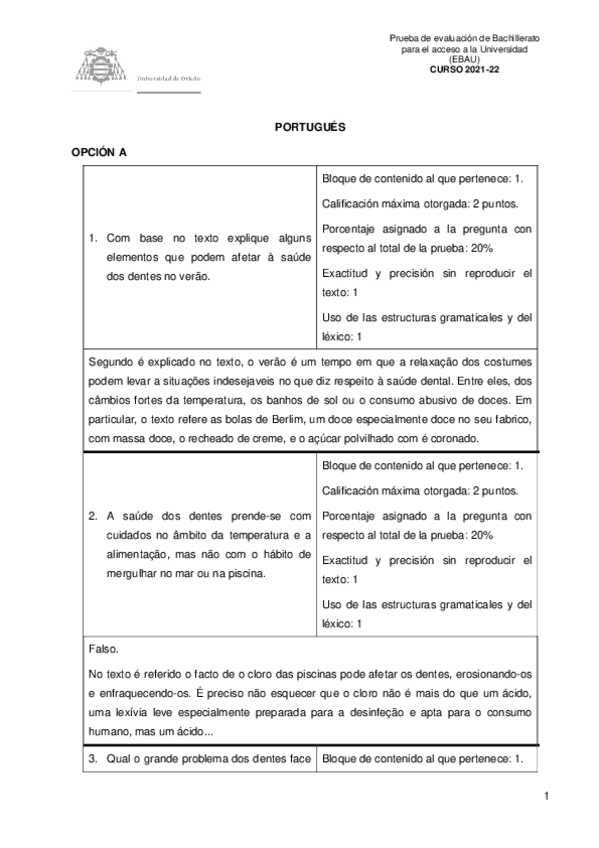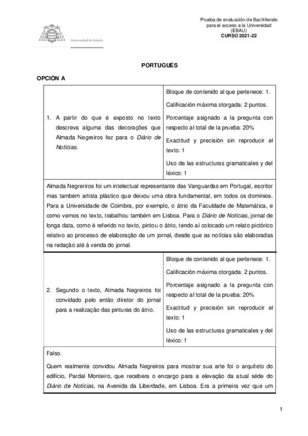 Exámenes y Exámenes Resueltos Portugués EBAU Asturias 2022