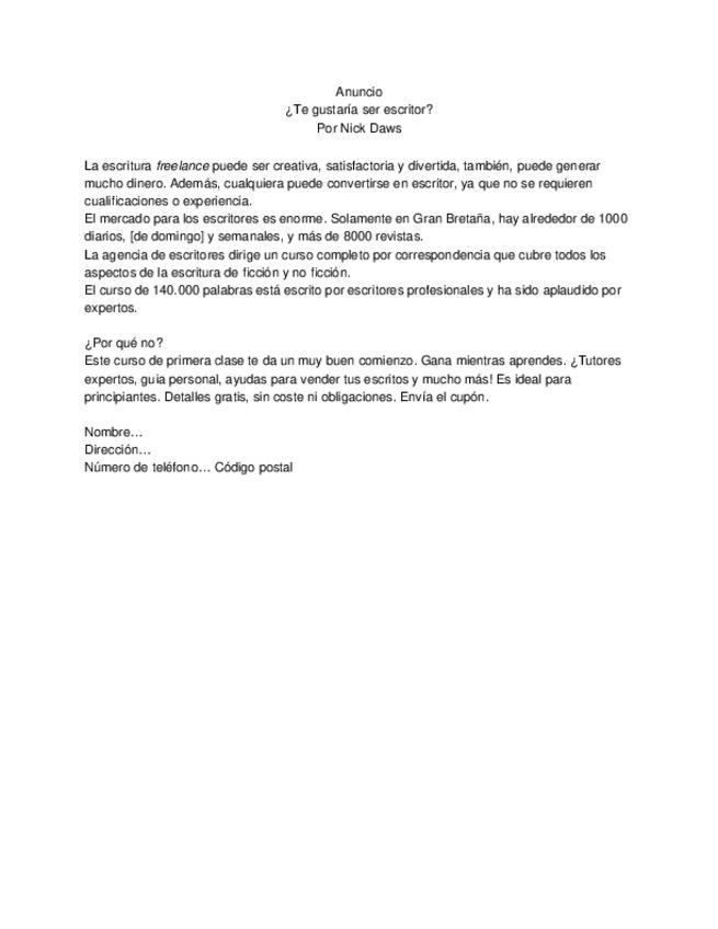 He publicado nuevos ejercicios de 2º Prácticas de Traducción II: Inglés-Español II: Primer-ejercicio-practico-Anuncio.docx