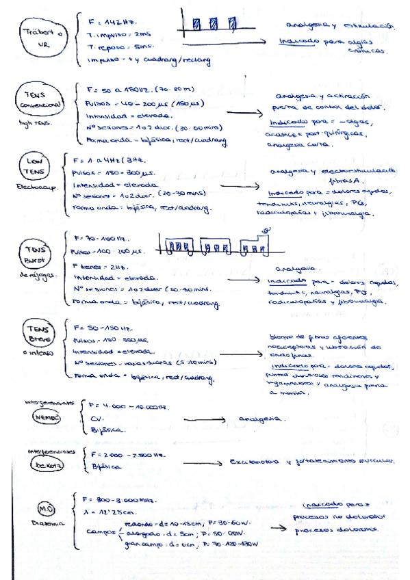 Tabla sobre patologias y que tipos de procedimientos se deben seguir con cada uno de los problemas que nos podemos encontrar en electroterapia