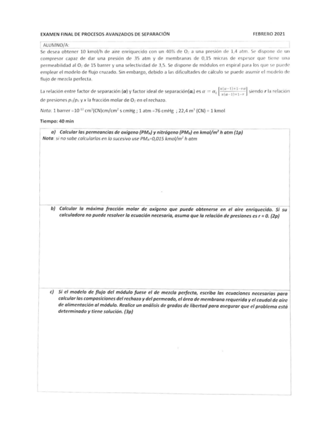He publicado nuevos examenes de 1º Procesos Avanzados de Separación: 1aC-Membranas-2020-2021.pdf