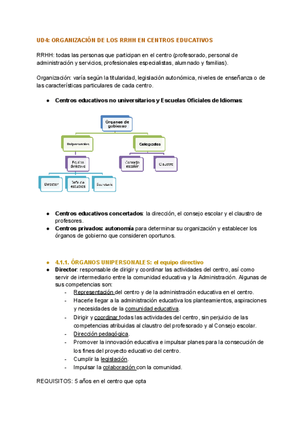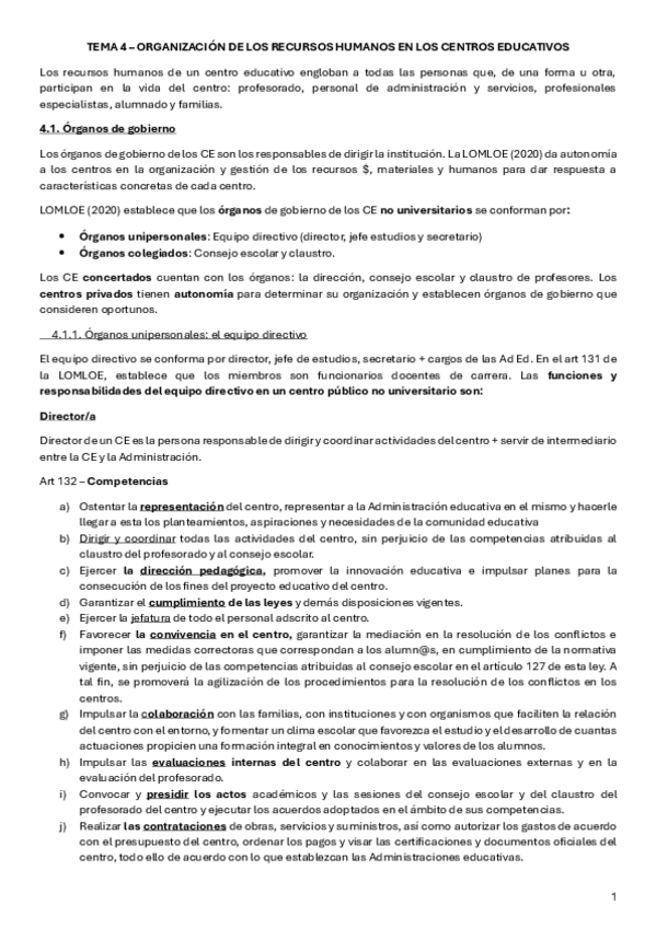 Resumen T4- Organización de los Recursos Humanos en los centros educativos, de la universidad Isabel I (Asignatura obligatoria)