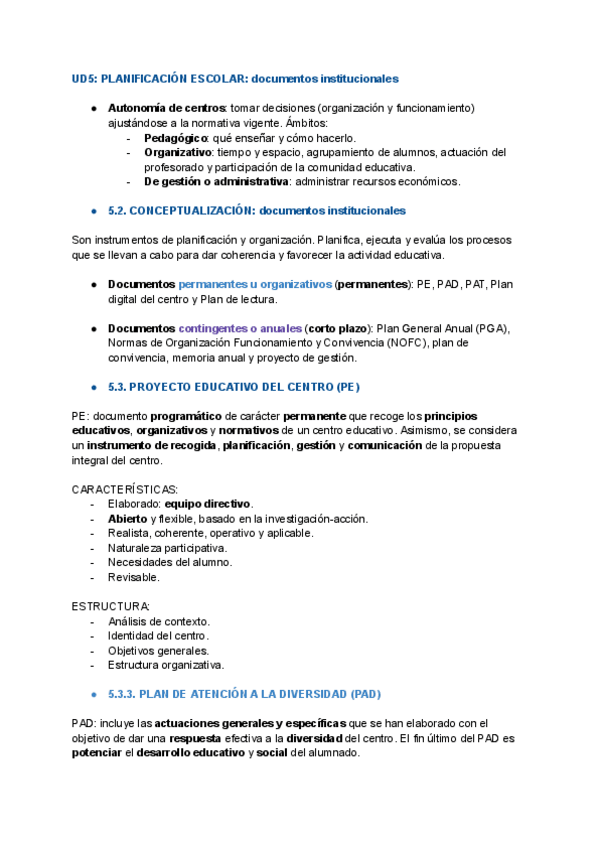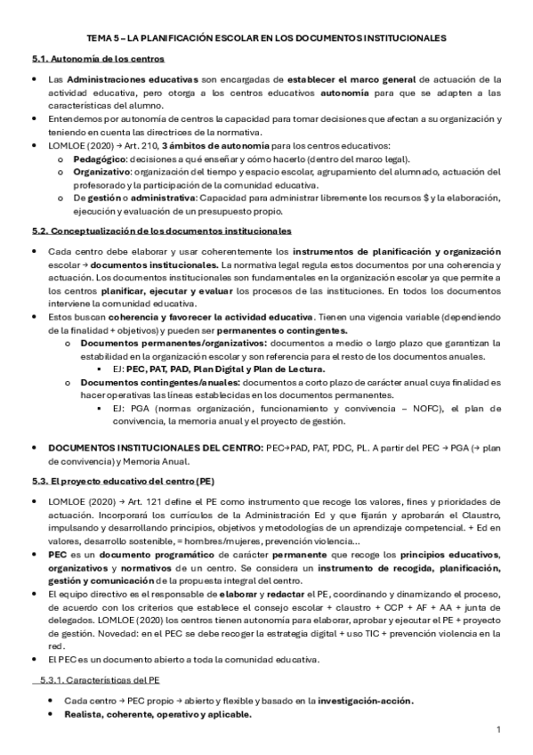 Resumen T5 - La planificación escolar en los documentos institucionales, de la universidad Isabel I (Asignatura obligatoria)
